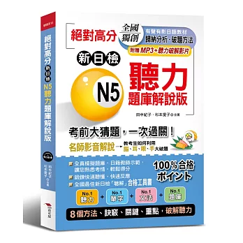 絕對高分:新日檢 N5聽力題庫解說版 ---名師影音解析,考前大猜題,一次過關(附MP3+聽力破解影片) ![]() |