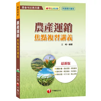 農產運銷一門學科包含經濟學、農業學,從運銷程序、運銷通道、運銷職能、台灣地區生產現況等均需熟悉,尤以題型多變,包含是非、選擇、問答、申論等等,準備上需要一本良好的參考書作為引導,本書即具有以下特點:1.提供農會應考60天及30天讀書計畫;2.作者以課前提要一針見血指導學習要領,提供考生摘要式的閱讀;3.為使考生在本科考試中應付裕如,特別依歷年考題方向,將農產運銷內容分章分類,為考生建立整體觀念架構,補充完整全面的理論;4.根據最新相關法規及時事修訂,資料與時俱進;5.增加圖表分析,將抽象的概念具體呈現,易讀性高;6.本書提供模擬試題使讀者能即時練習,體會實際應試情境,達到事半功倍之效,並驗收閱讀成果。